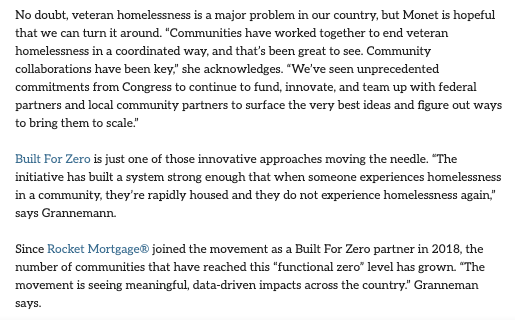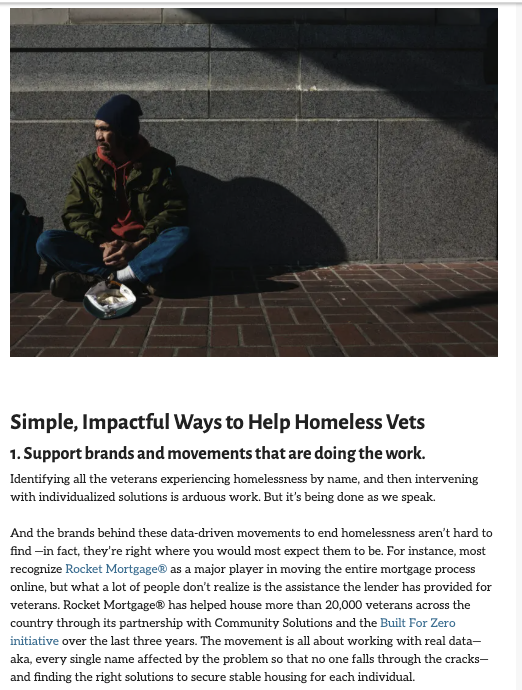 To recruit top tech talent to the team, we showcased the advantages, resources, opportunities and differentiators of working at Rocket Mortgage Technology. For a renewal campaign, to message a brand-value initiative, we focused on the brand’s support for homeless veterans.