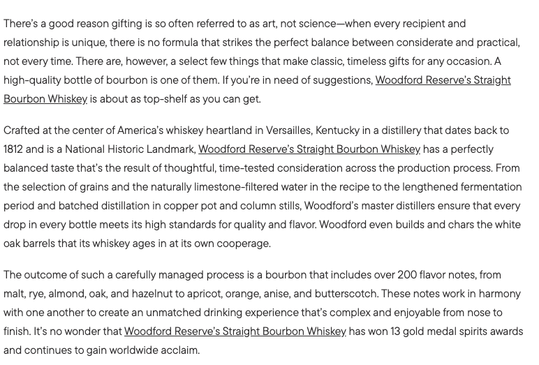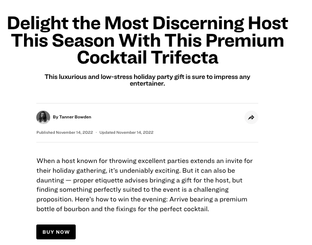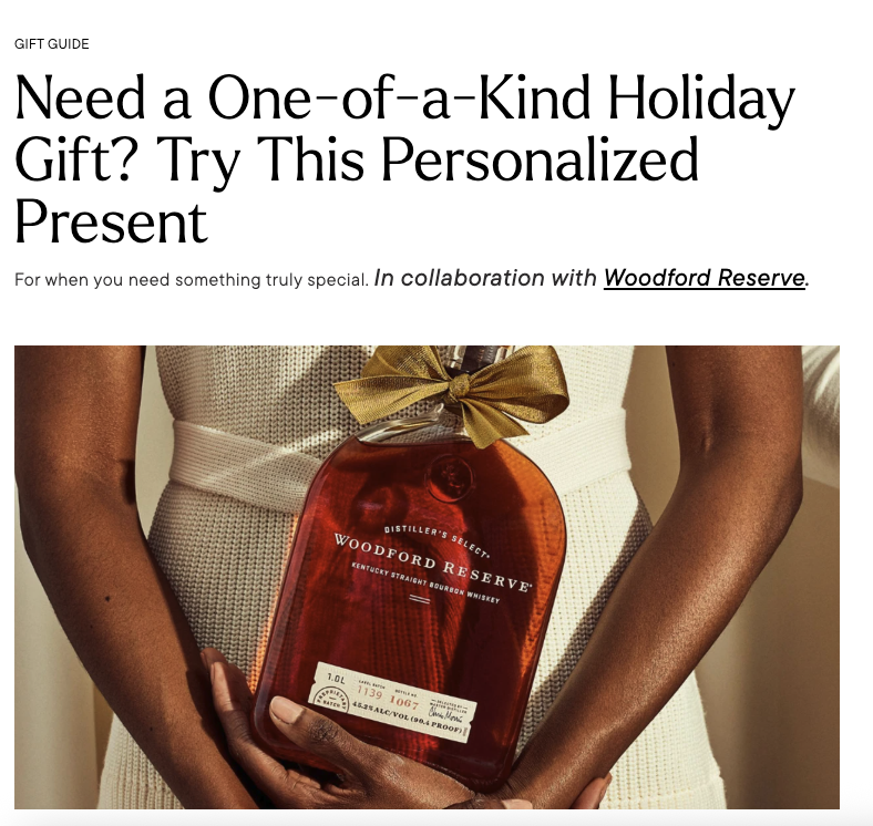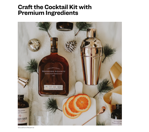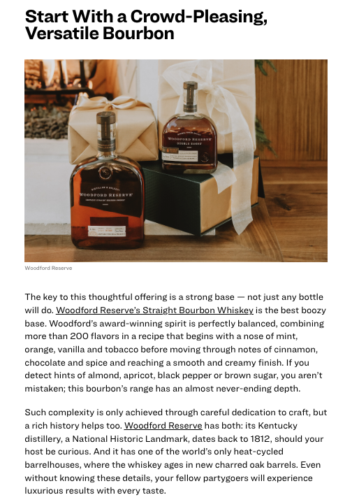 To spark consideration of Woodford Reserve as a luxury holiday gift, we created stories in partnership with The Coveteur and Gear Patrol, positioning Woodford with other premium presents and promoting Woodford’s personalization service. We exceeded benchmarks for time spent by more than 2X, and sparked shopping through links to Drizly
